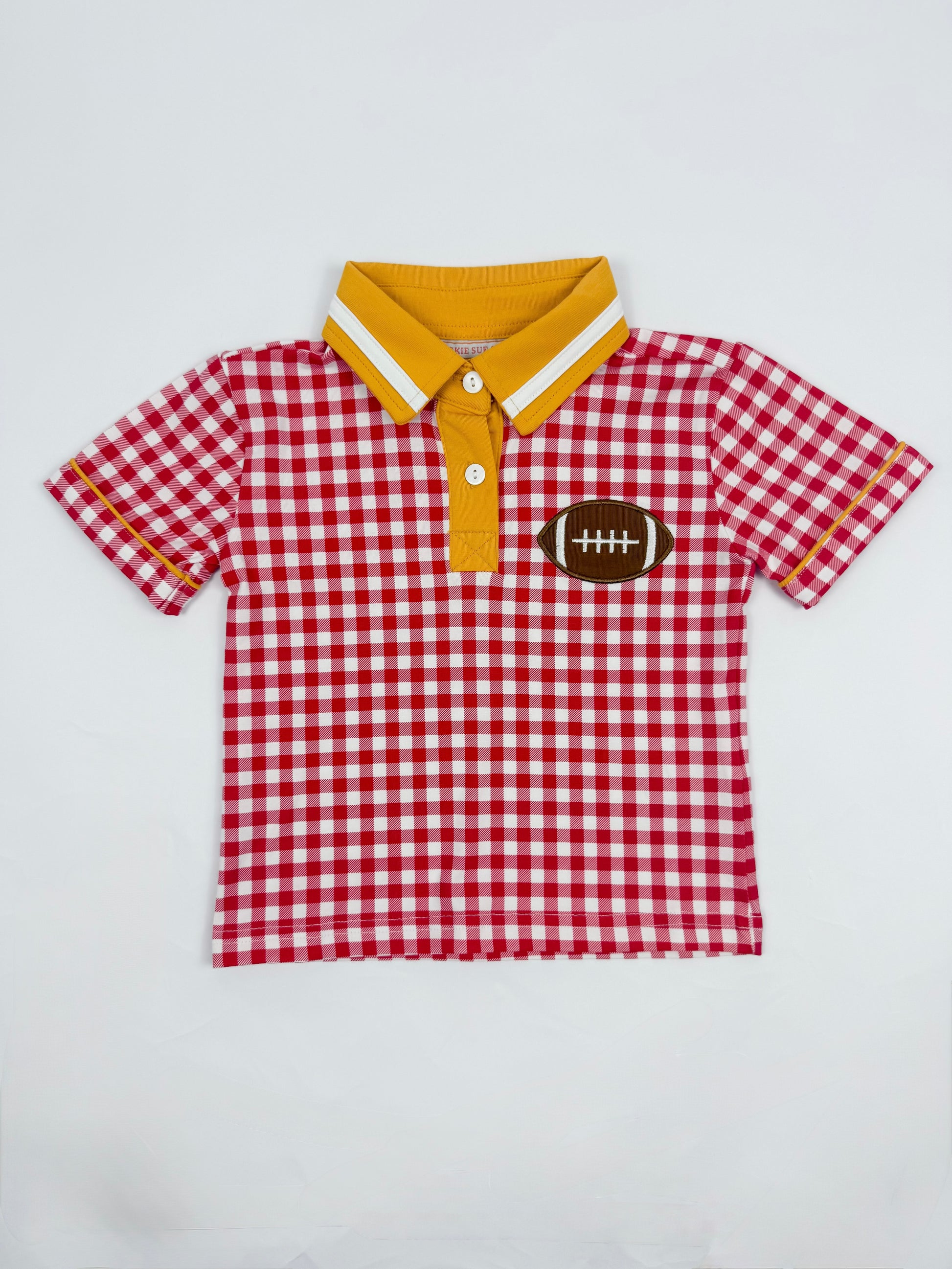 Get your little fan game-day ready in our Boys Chiefs-Inspired Polo, the perfect blend of comfort, style, and team spirit. Featuring a bold red base with crisp gold accents and an adorable appliqué football, this polo is the ultimate nod to Kansas City pride.