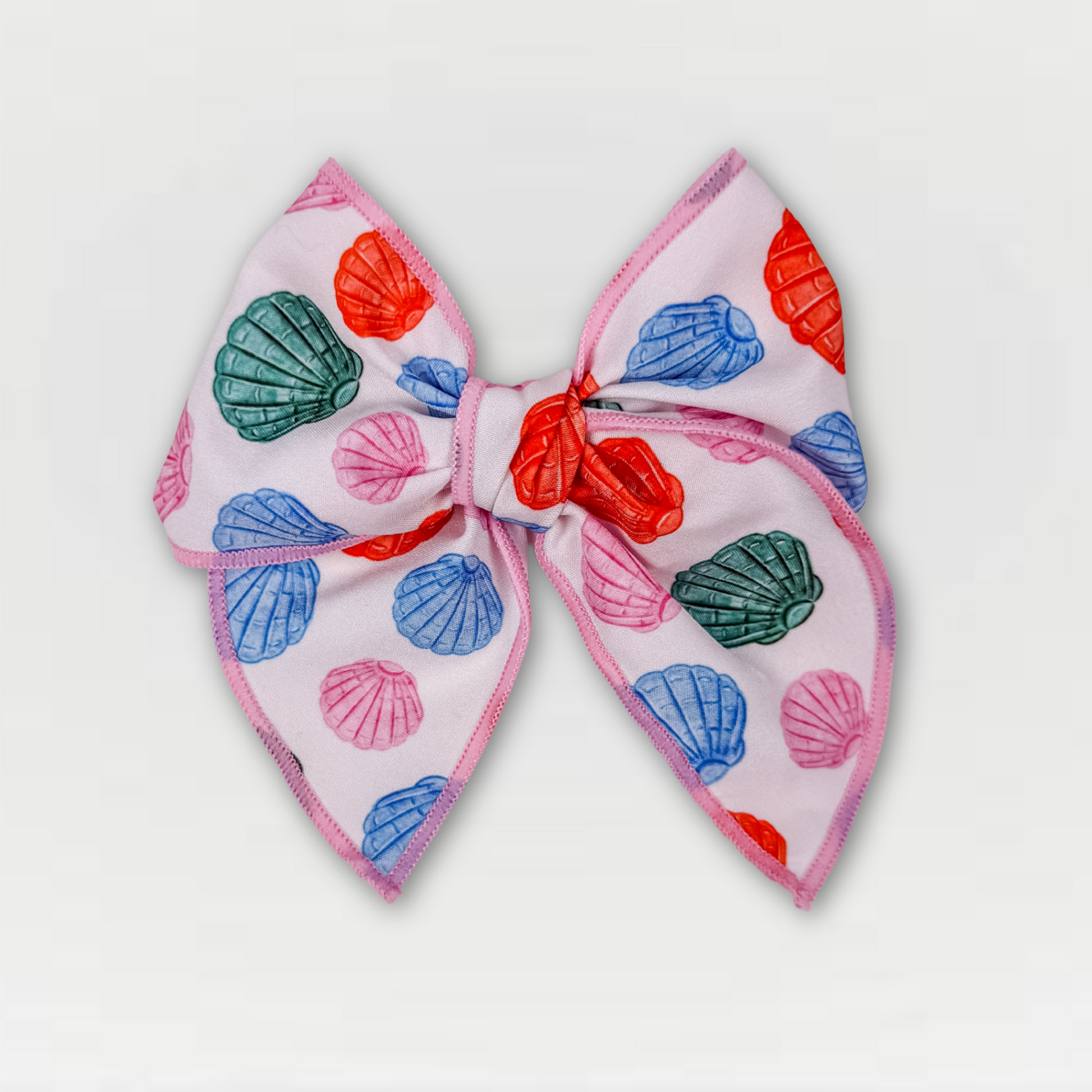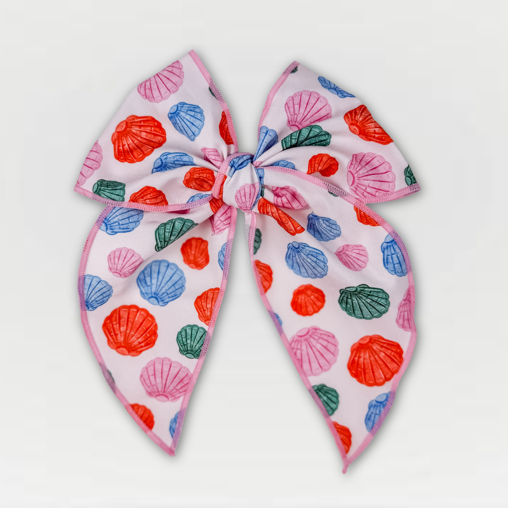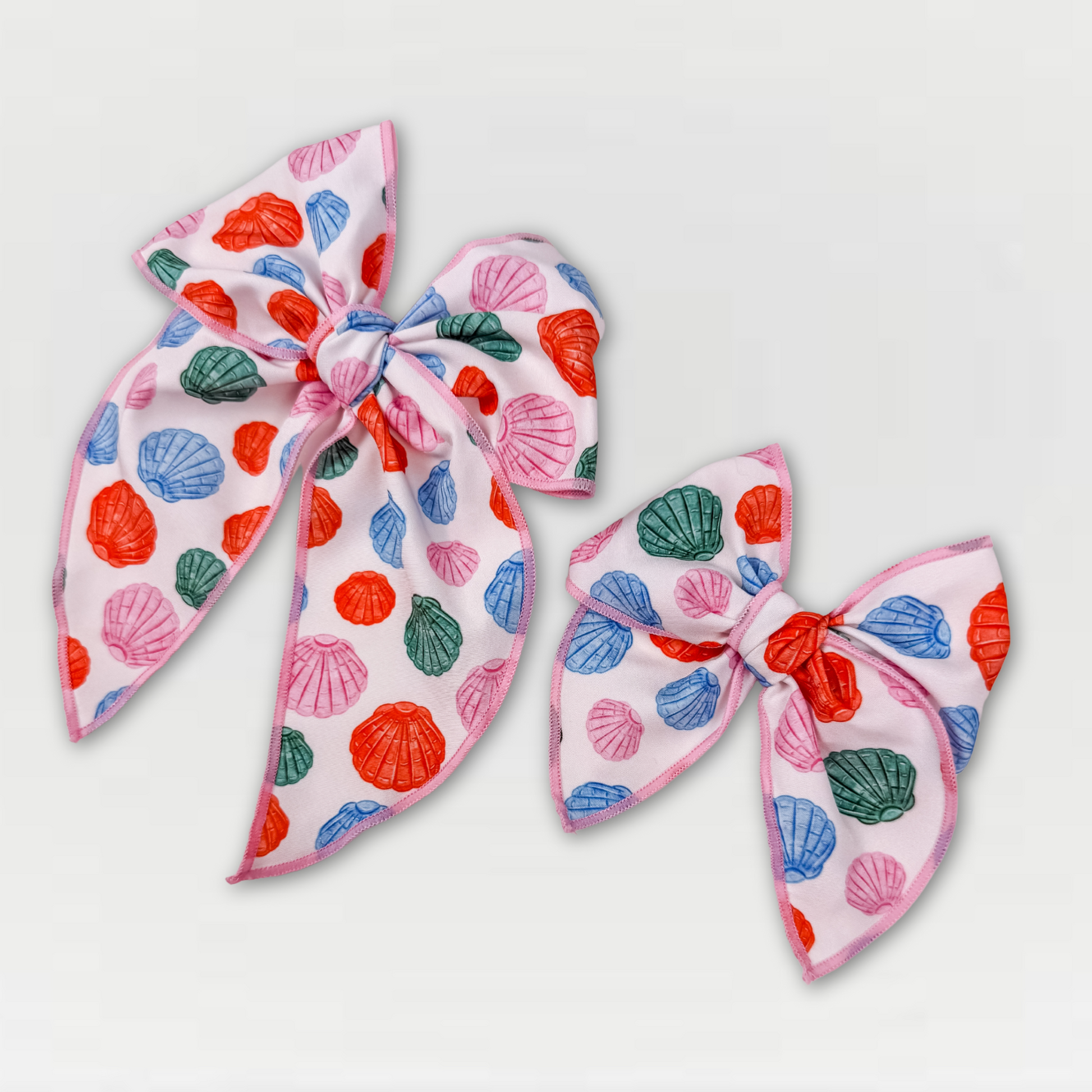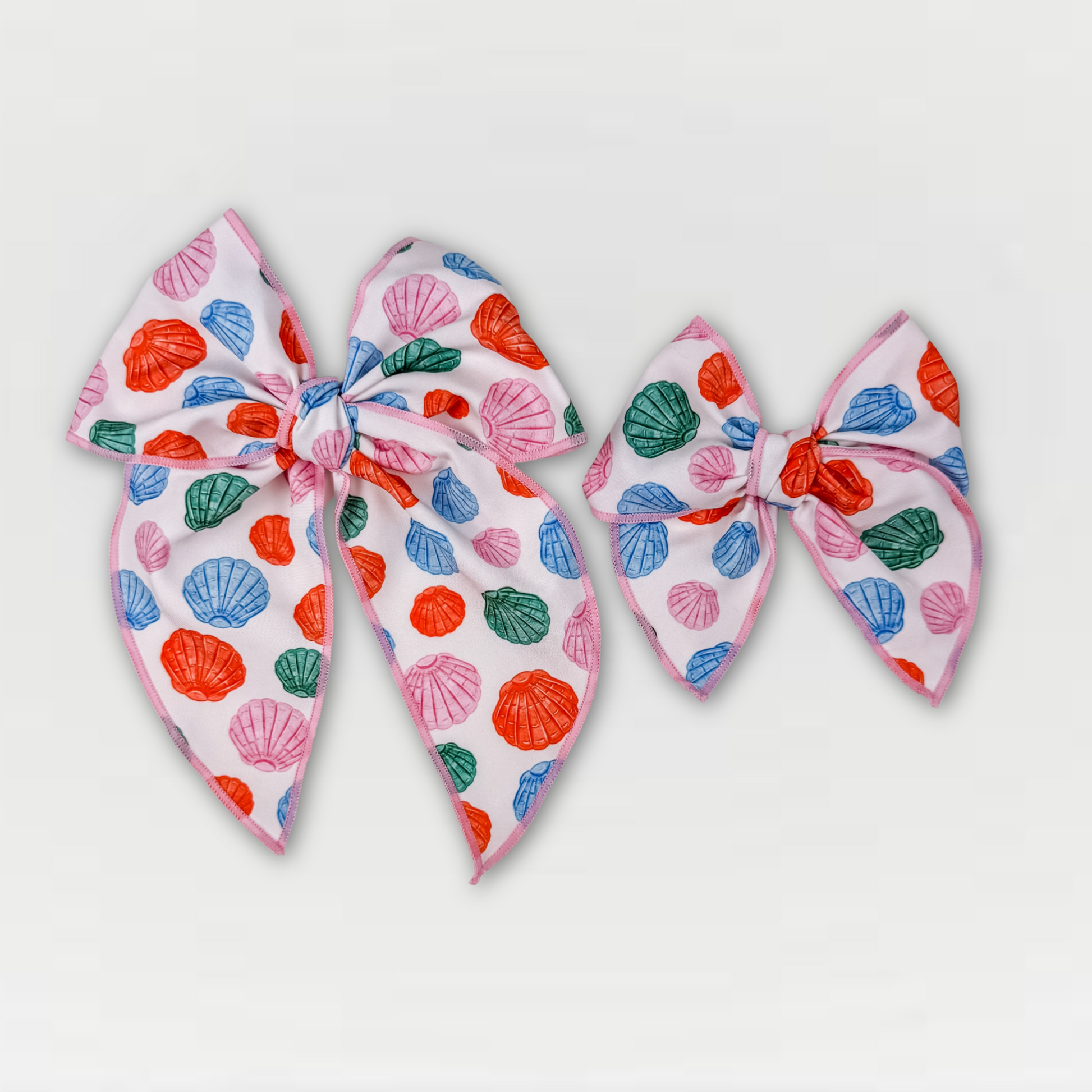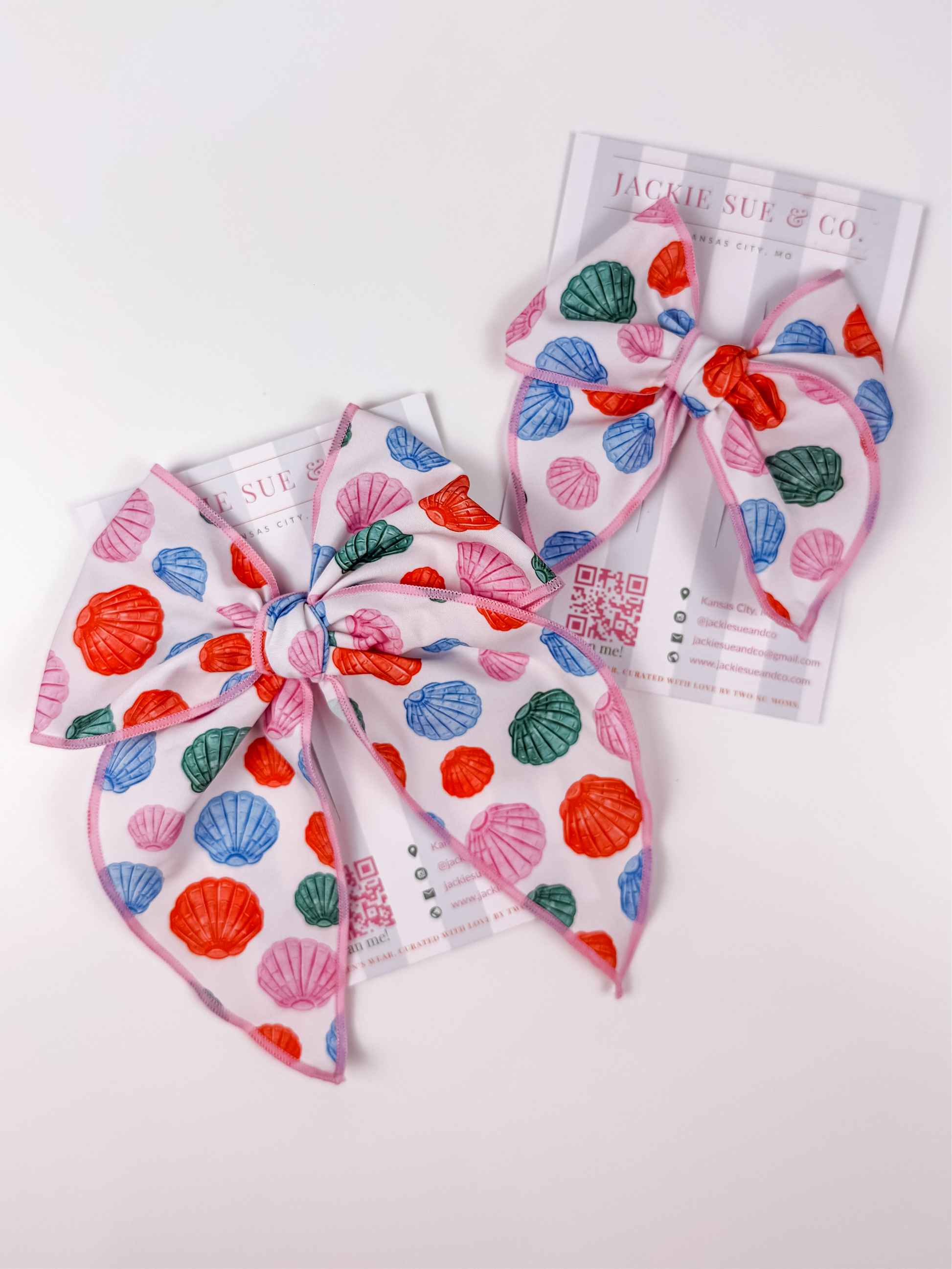 Make a splash with our vibrant Seashell Print Bows, featuring a whimsical pattern of pink, blue, green, and orange shells inspired by ocean treasures. Perfect for beach days, summer outfits, or adding a coastal charm to everyday wear. These bows come in both large and small sizes, making them ideal for matching sibling sets, mommy-and-me looks, or versatile styling options. Add a pop of seaside style to your accessory collection!