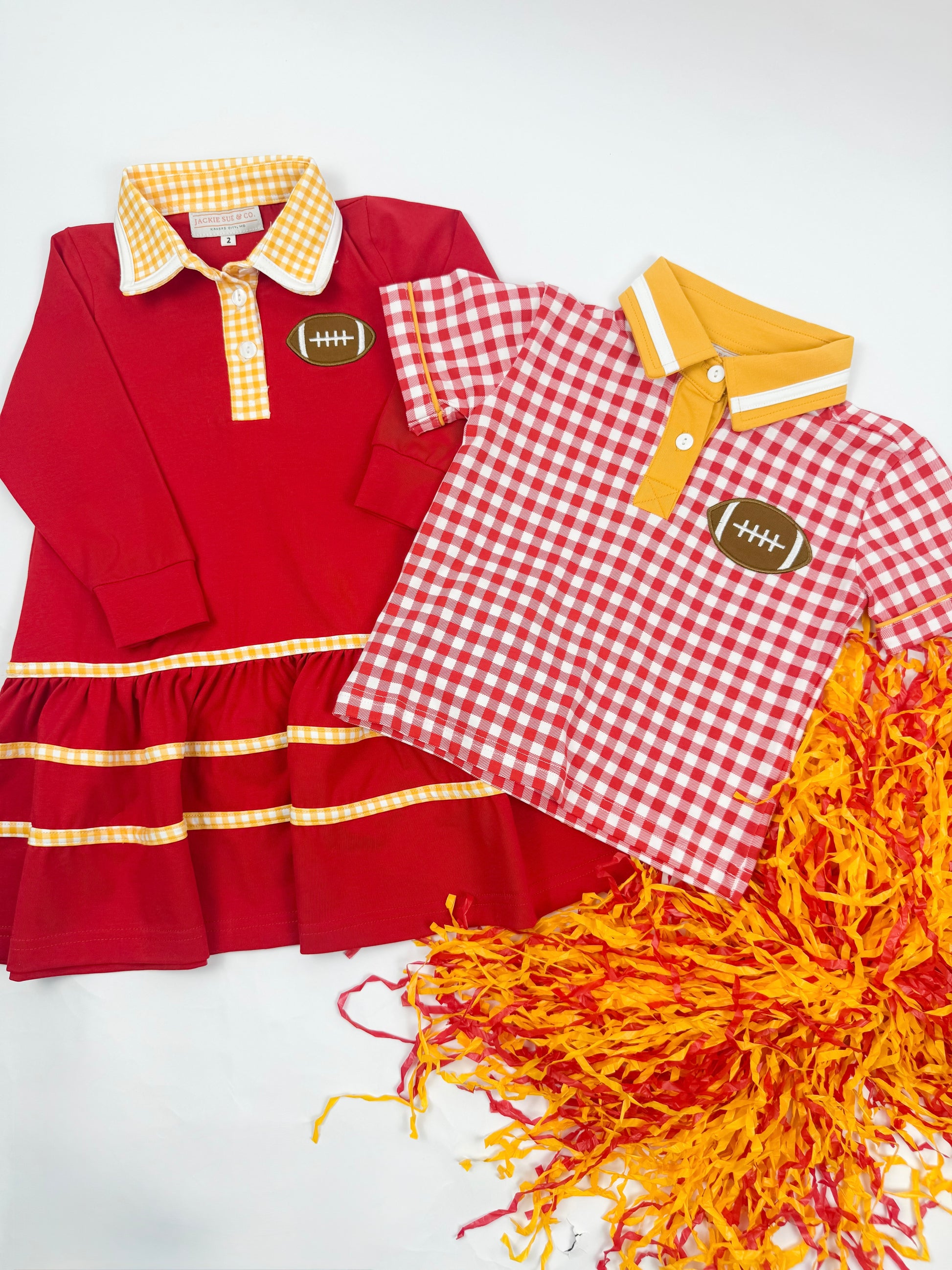 Calling all tiny Kingdom cuties! Our Kansas City Gameday Spirit Dress is the sweetest way for your little one to show off her red and gold pride. This long-sleeve knit dress features a yellow gingham collar and placket, plus a playful embroidered football on the chest — the perfect game day detail.