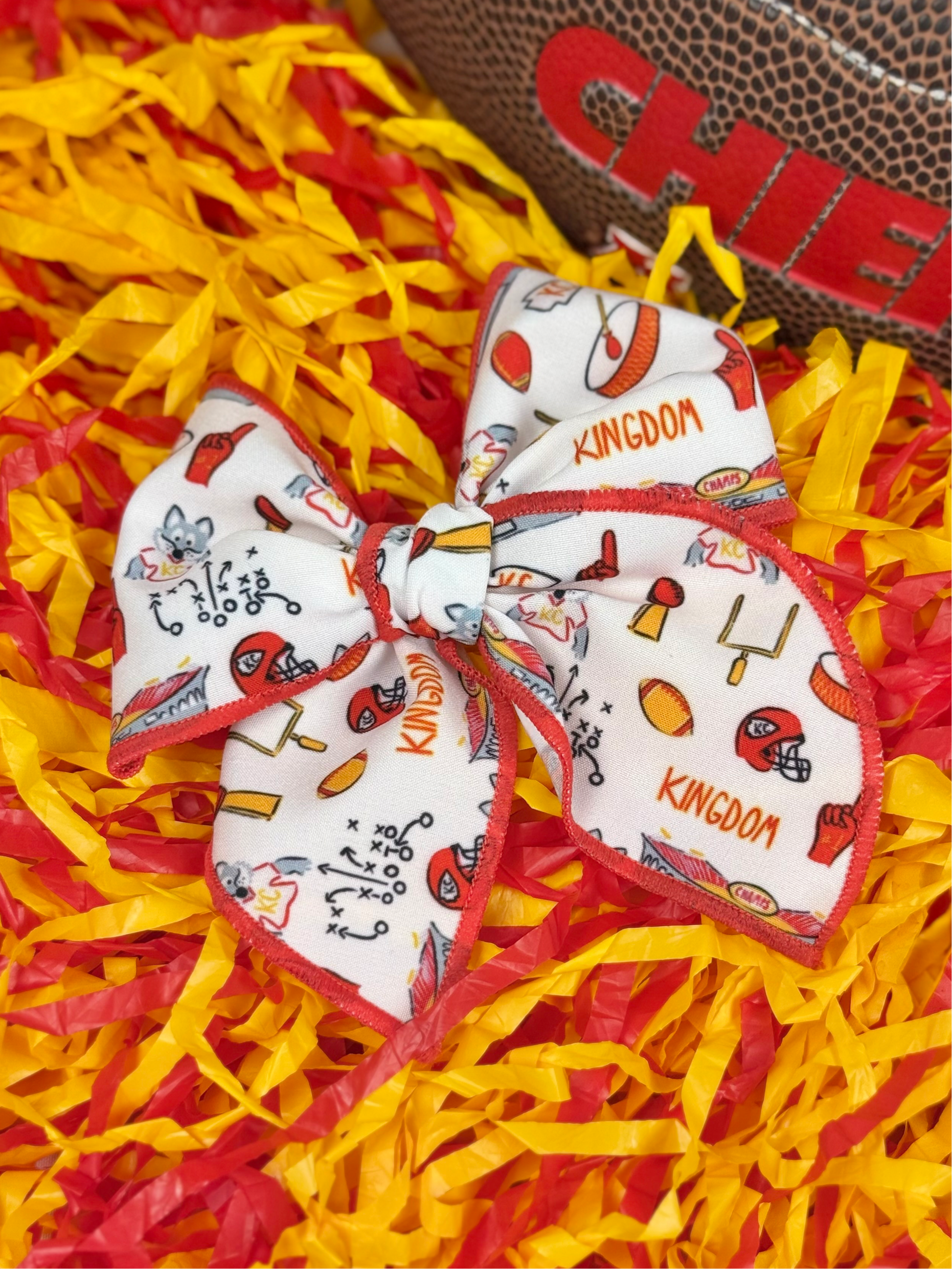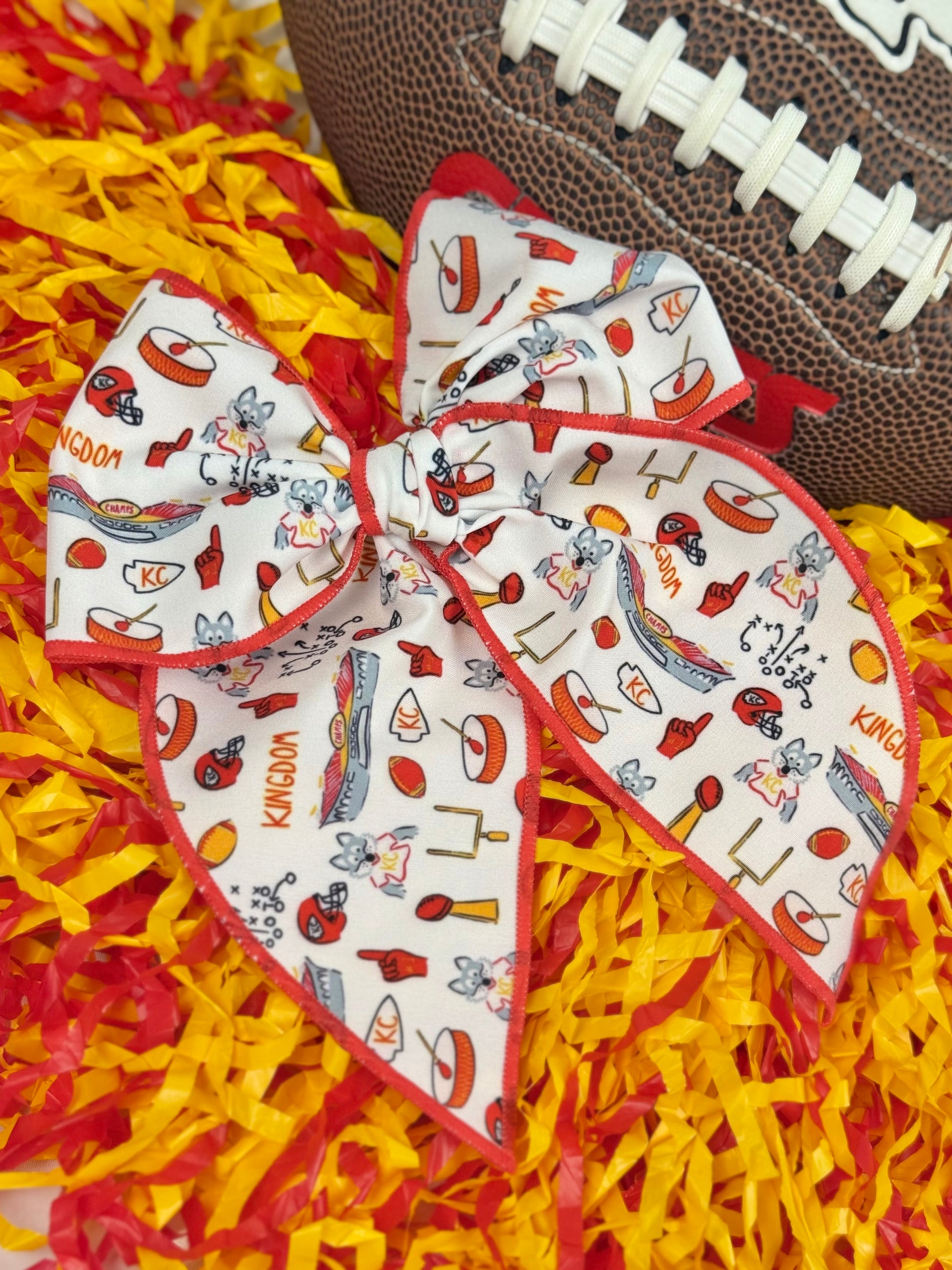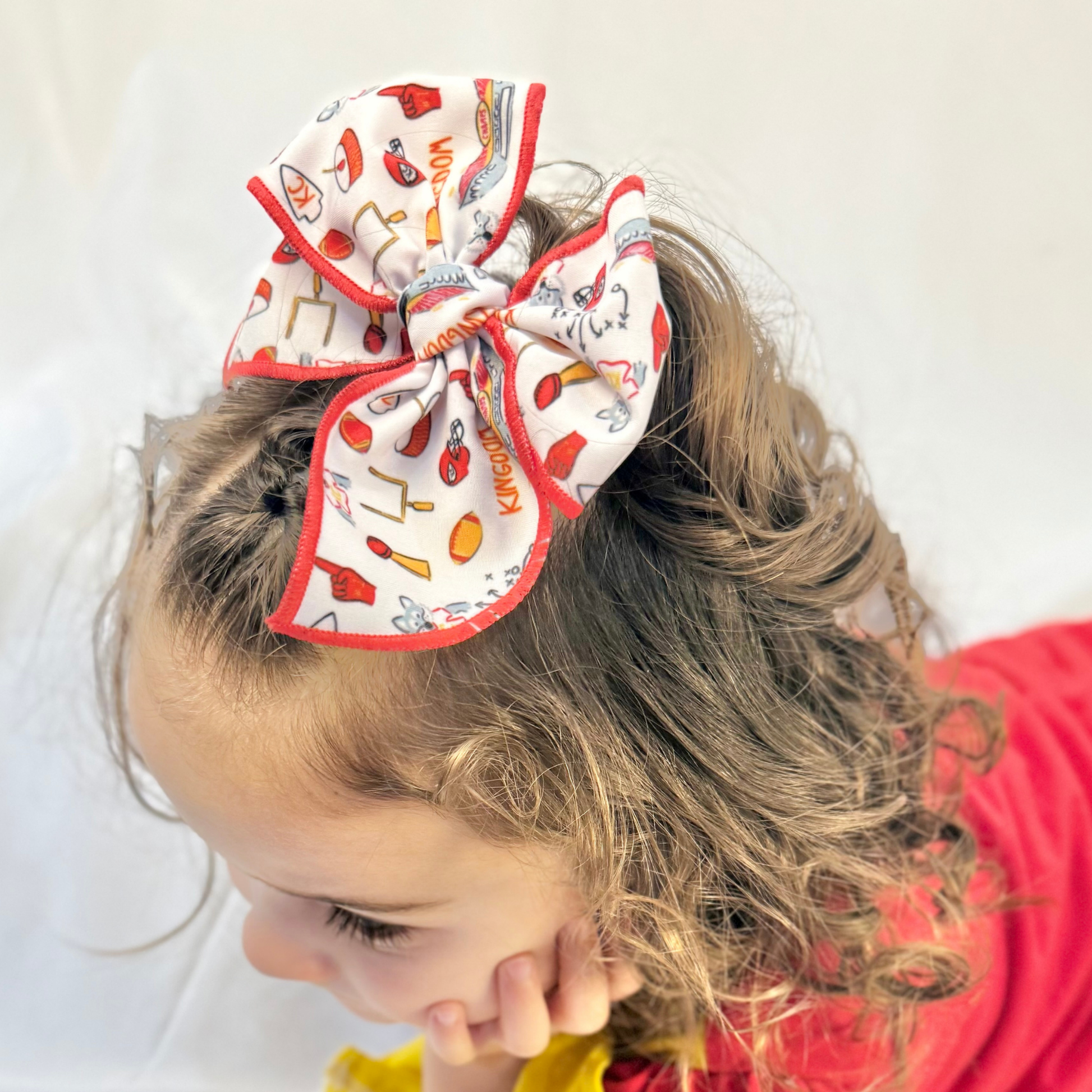 Show your Kansas City Chiefs pride in a fun, fashionable way with our Kingdom Print Bow Hair Clip! Available in two sizes—a small 4" bow and a large 6" bow—each features an eye-catching design with iconic images like the Chiefs' stadium, KC Wolf, the championship trophy, and the beloved drum. Whether you're cheering on the team at Arrowhead or showing off your KC spirit every day, this clip is the perfect accessory to add a touch of team pride to any outfit. The secure, stay-in-place clip ensures it stays right where you want it, all day long.